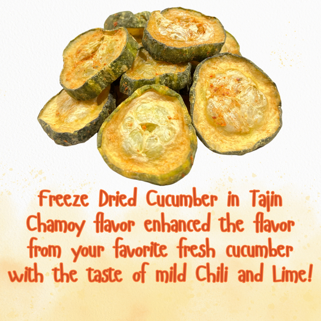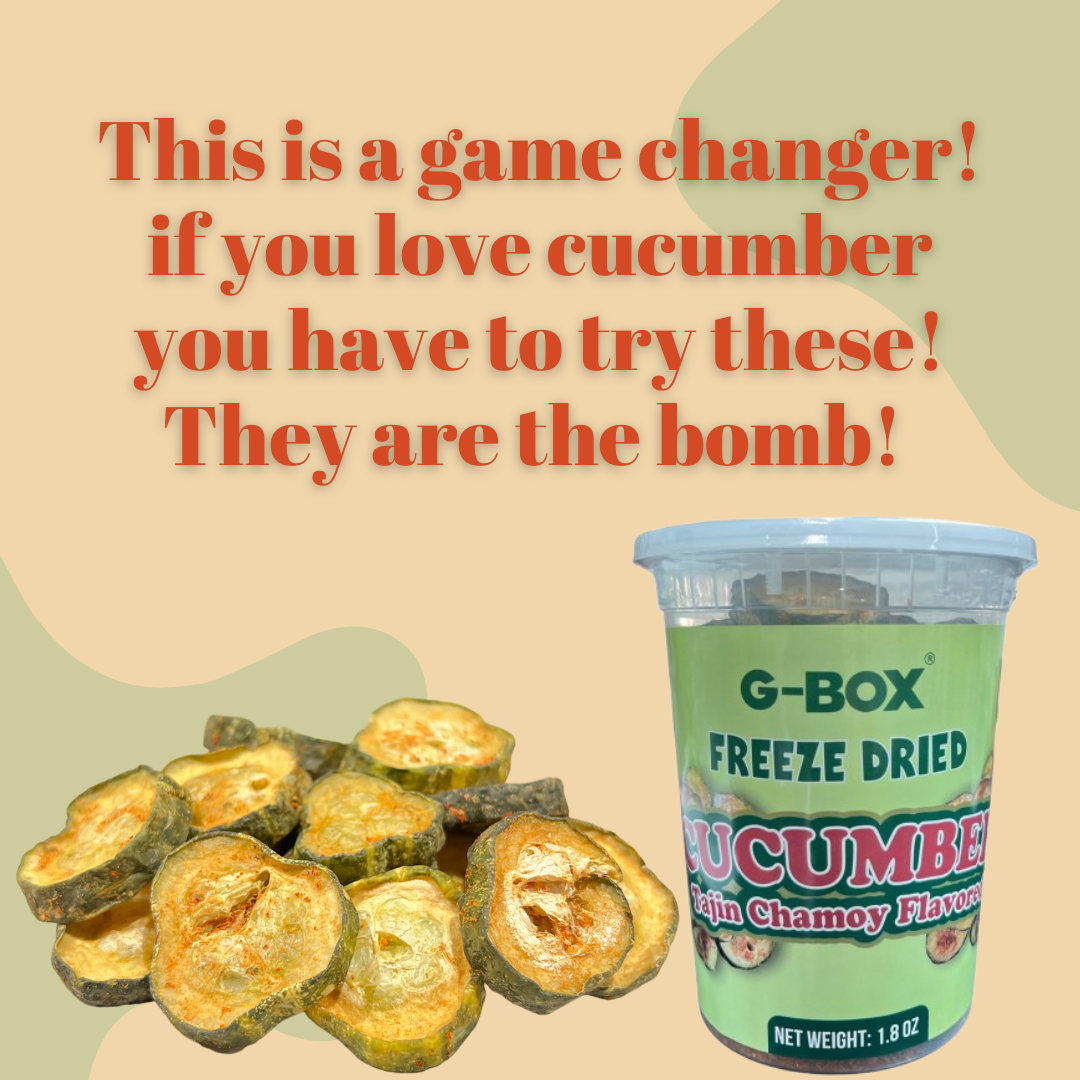 Introducing G-BOX Freeze - Dried Tajin Chamoy Cucumber Chips – a crunchy and tangy delight that redefines the snacking experience. Crafted under the G-BOX brand, these pickle chips offer a unique twist on the classic dill pickle, combining bold flavor with a satisfyingly crisp texture through our state-of-the-art freeze-drying process.