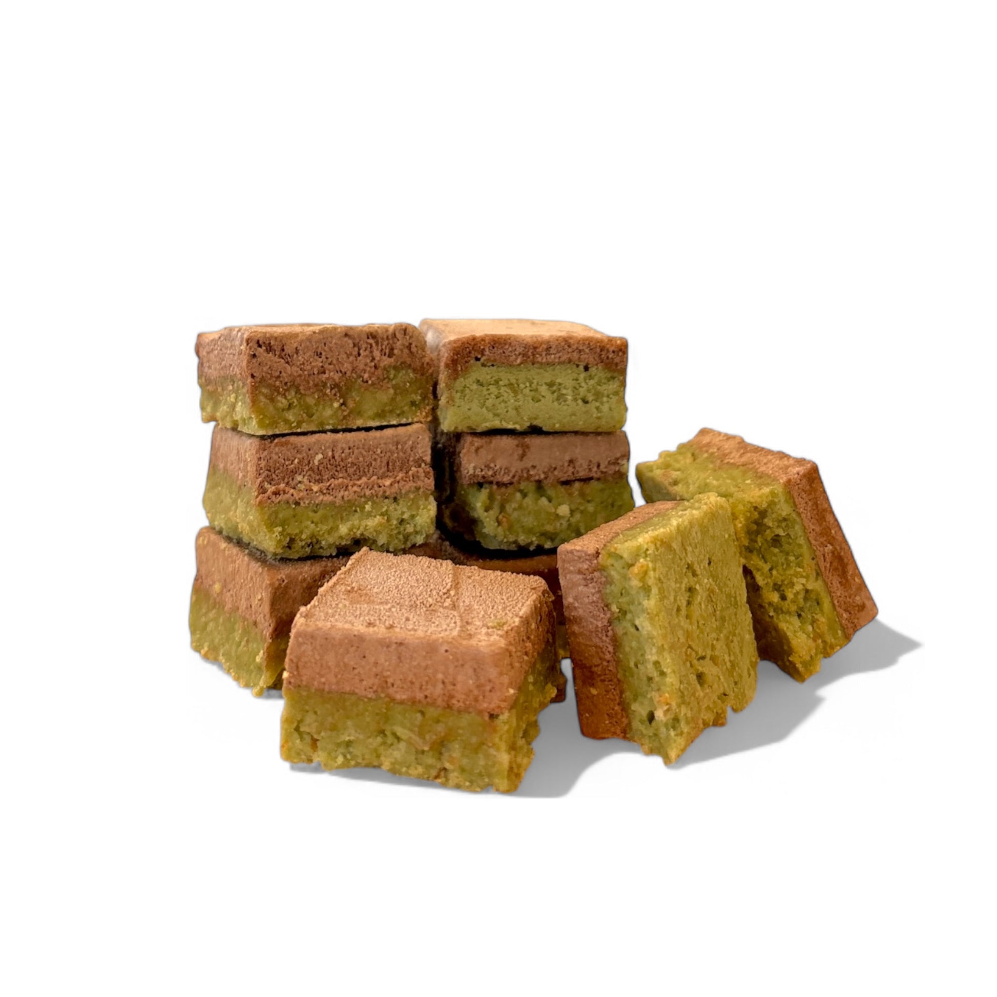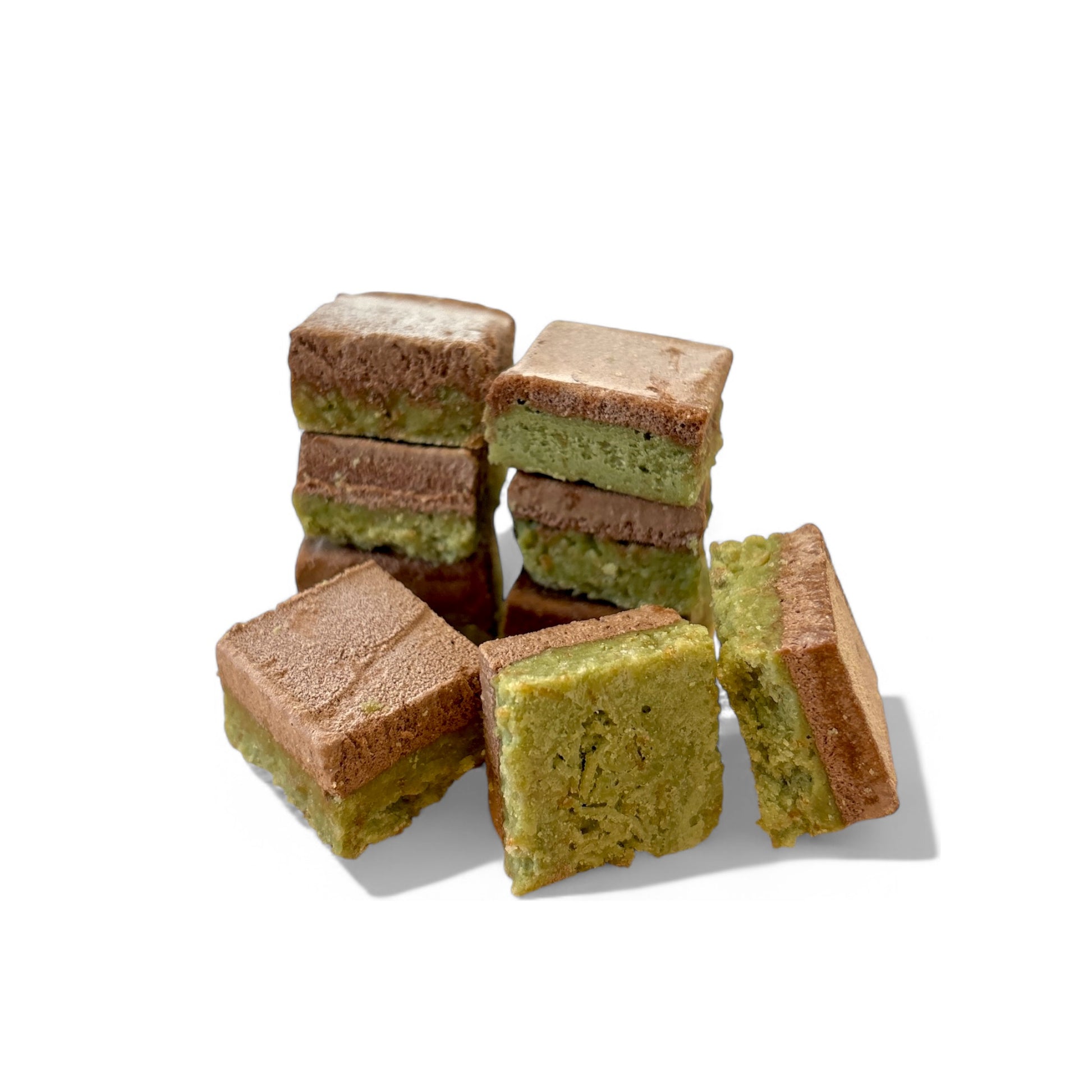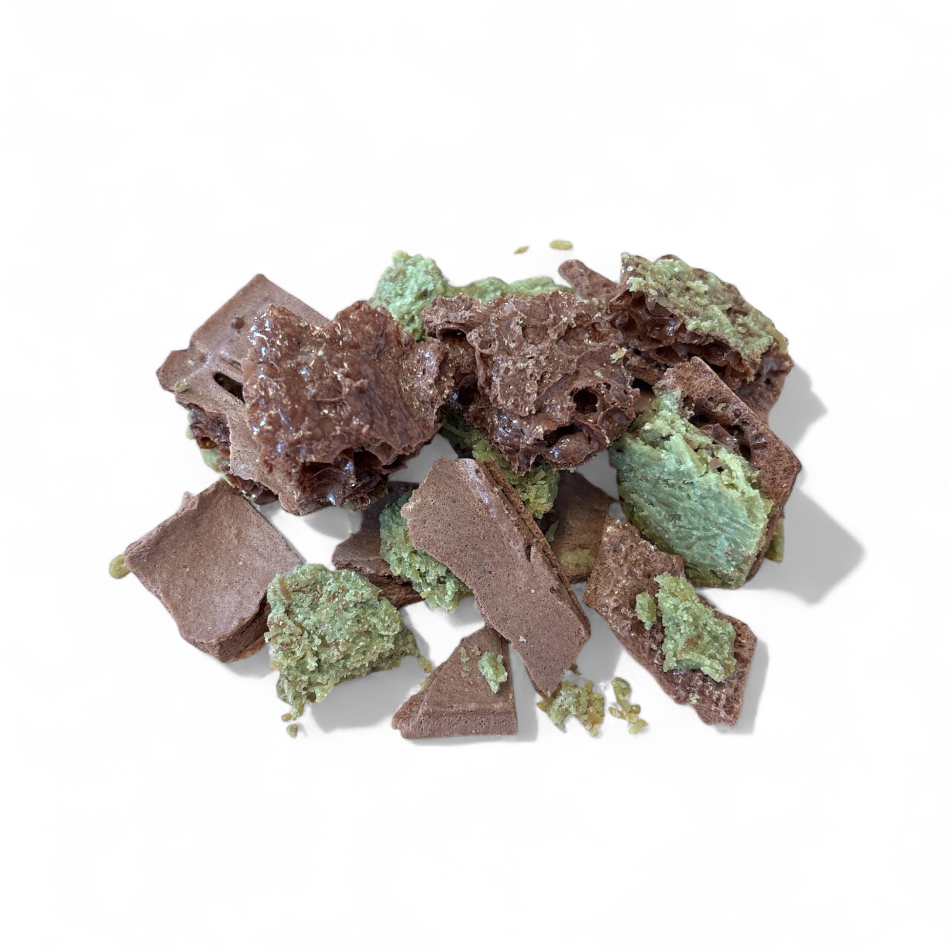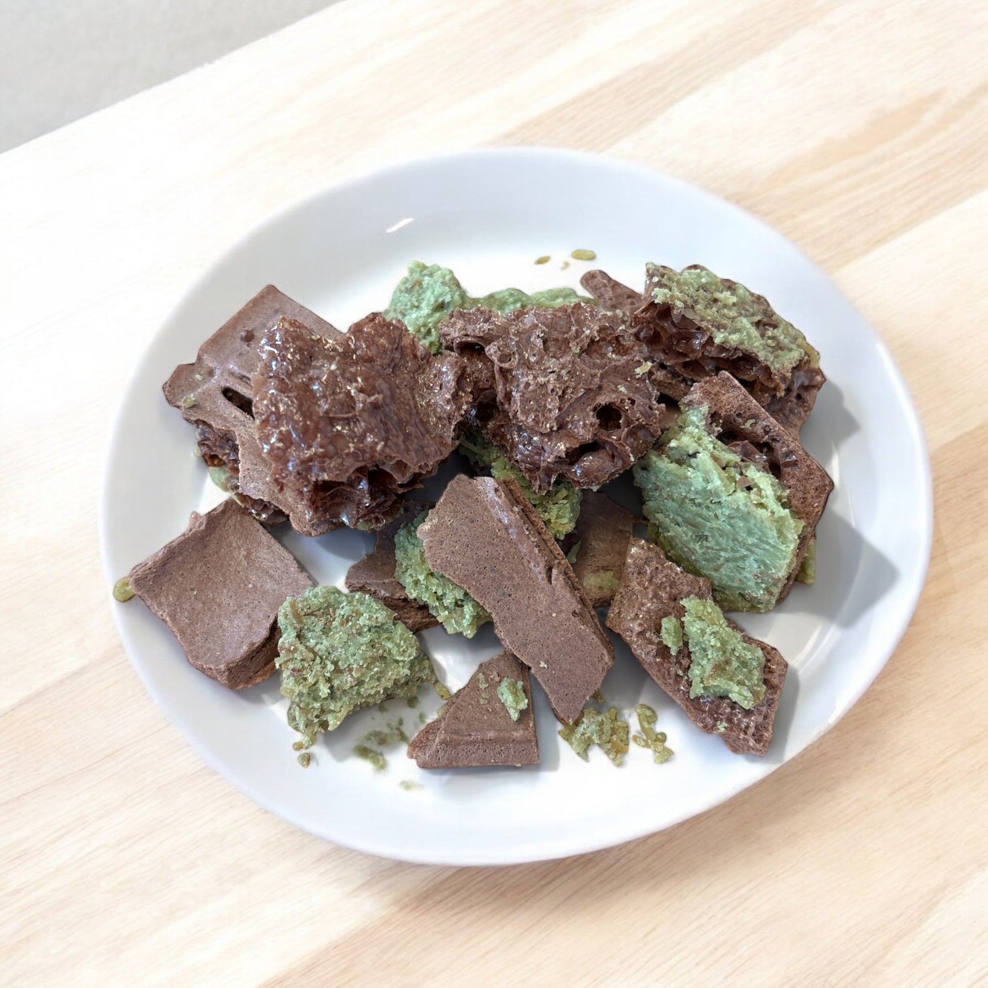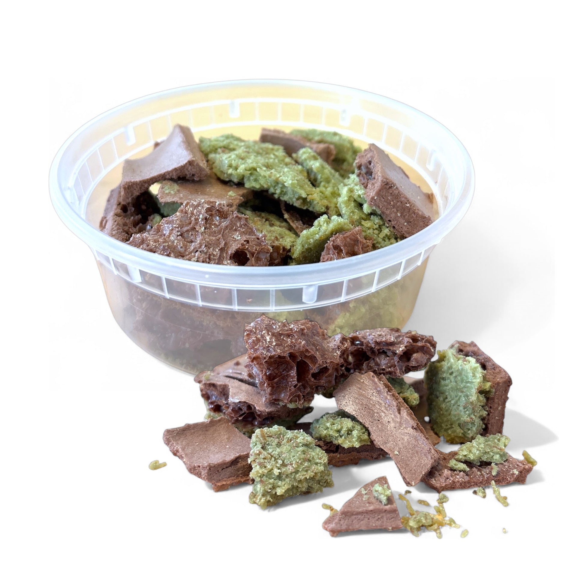 Each cube is made from rich chocolate ice cream infused with smooth pistachio flavor, delivering the nutty sweetness and creamy depth you’d expect from premium pistachio cream. The texture is where the magic happens — our advanced freeze-drying process locks in flavor while removing moisture, turning every bite into a light, crispy, melt-in-your-mouth sensation. Hints of buttery pastry flavor inspired by shredded Turkish kataifi dough add a subtle, layered crunch that completes the experience.