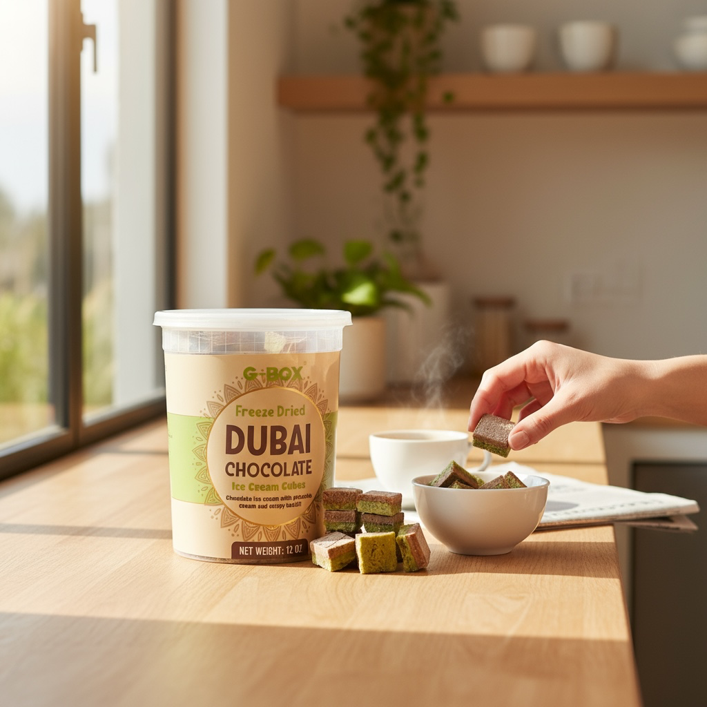 Experience the indulgent taste of Dubai’s most iconic dessert in a whole new way with G-BOX Freeze Dried Dubai Chocolate Ice Cream Cubes. Inspired by the luxurious viral chocolate that's taken the Middle East by storm — filled with velvety pistachio cream and wrapped in crisp, golden kataifi dough — we’ve transformed those bold flavors into a modern, freeze-dried twist that’s as innovative as it is delicious.