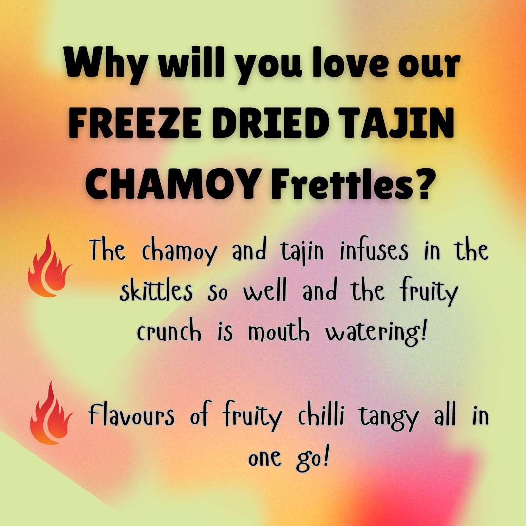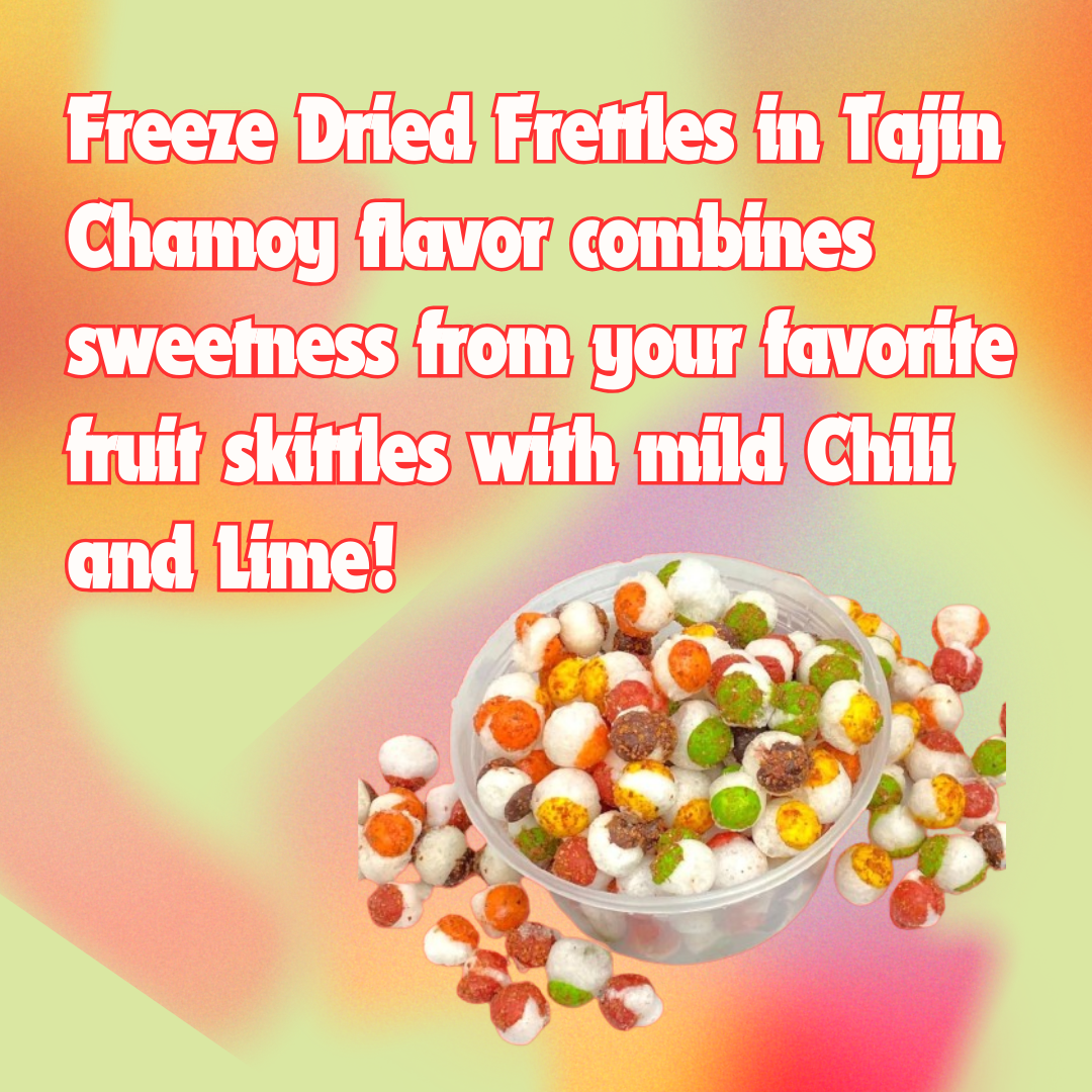 G-BOX Freeze-Dried Frettles start with the classic rainbow of fruit flavors that Frettles are famous for – from zesty lemon to juicy strawberry. But we don't stop there. We elevate the experience by infusing each piece with the tangy, spicy, and slightly sweet essence of Tajin Chamoy, creating a harmonious blend of taste sensations that will leave your taste buds craving more.