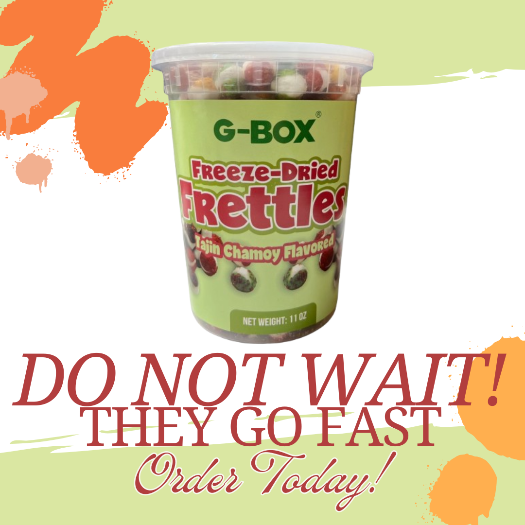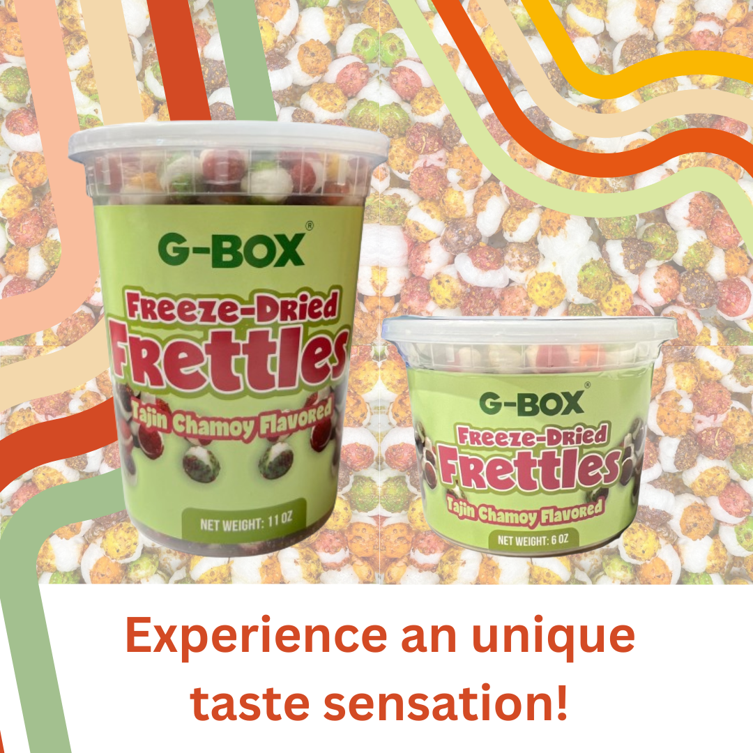 Introducing G-BOX Freeze-Dried Frettles with a tantalizing Tajin Chamoy twist – an explosion of flavor that will redefine your snacking experience! Crafted under the renowned G-BOX brand, these innovative treats combine the fruity goodness of Frettles with the zesty kick of Tajin Chamoy, all in a convenient, crispy form.